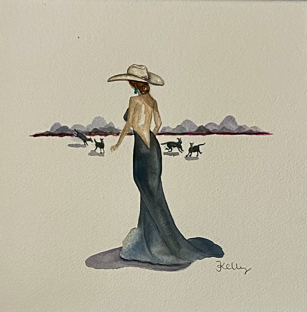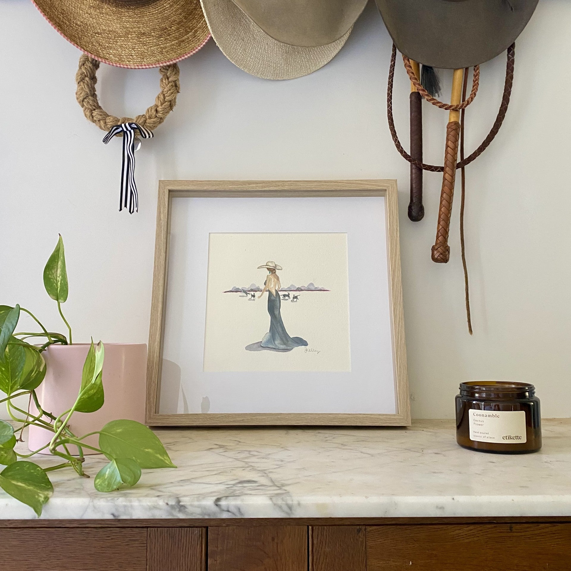 Will There Be Cowboys? is an original watercolour on 640gsm cold pressed Arches paper. It measures 25 x 25cm. It is framed in light oak with a white mat, framed size 45 x 45cm.