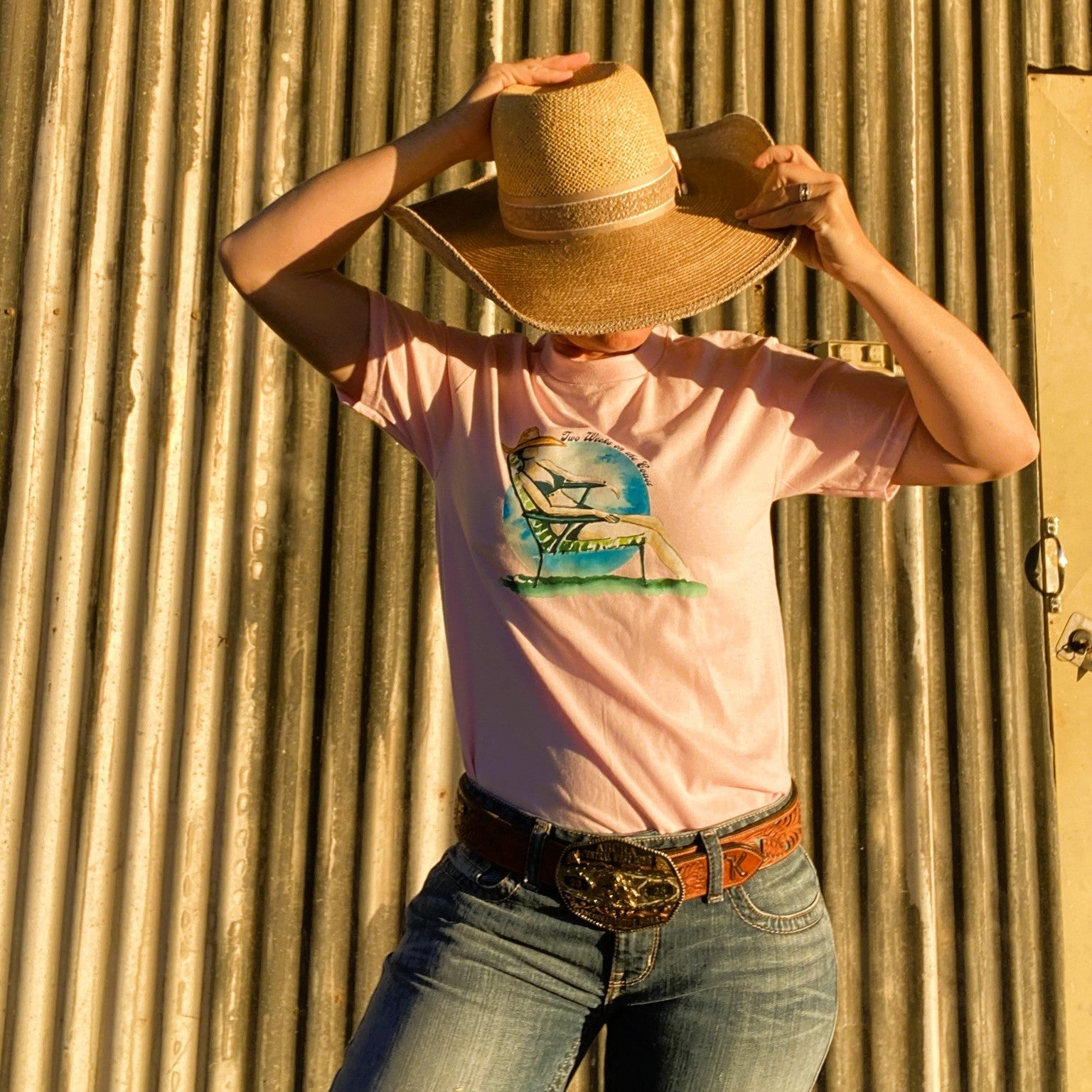 Baby pink heavy-weight t-shirt with a wide ribbed round neck, featuring artwork by Miss Vet. A classic, relaxed cut that is 100% cotton in unisex sizing. Designed and printed in Australia.